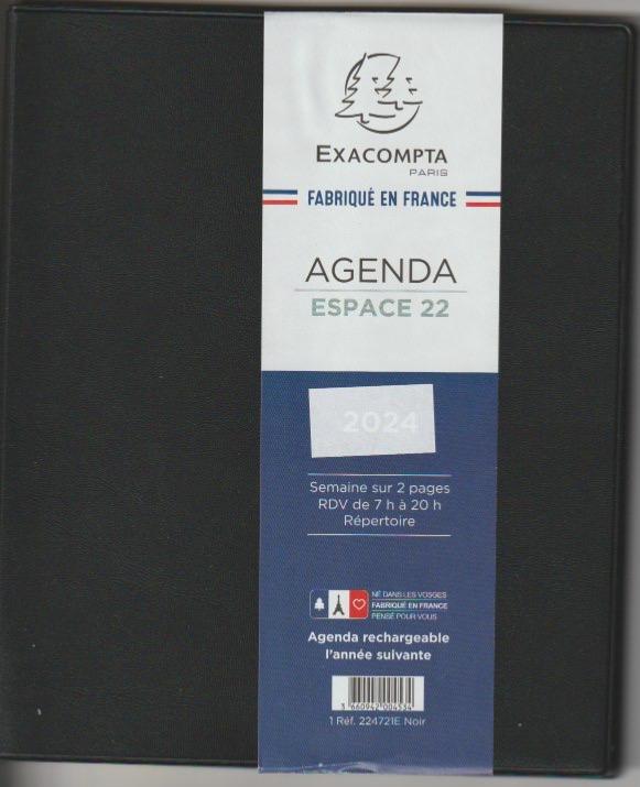 Agenda Exacompta Espace 22 année civile de décembre a décembre avec planning cartes et renseignements divers Couverture plastique Impala grainée noir. 1 semaine sur 2 pages avec 1/2 page de note voir la photo , heure par heure de 7h à 20h. Très beau papier vélin blanc 90 g. .