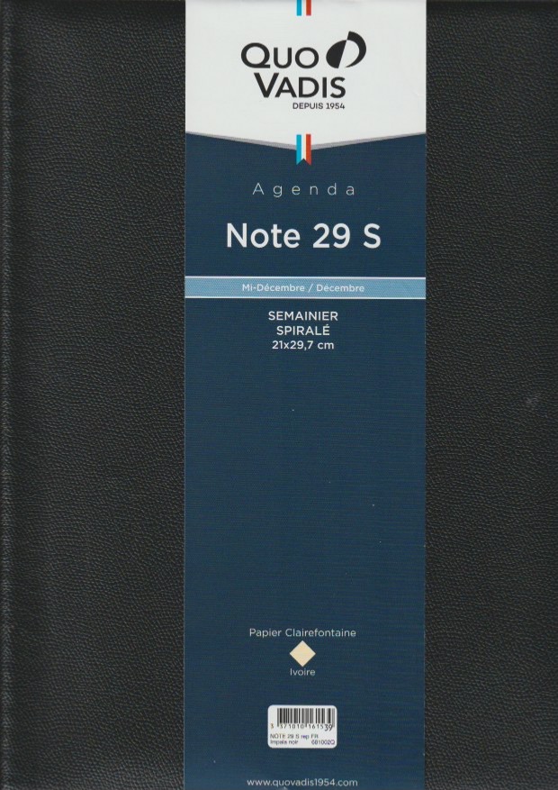 Agenda Quo vadis président année civile de décembre a décembre avec planning cartes et renseignements divers Couverture plastique Impala grainée noir. 1 semaine sur 2 pages, de 7h à 20h. Très beau papier vélin blanc 90 g. .